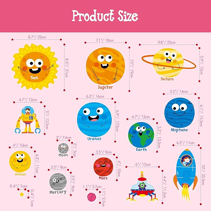 - Wide Application: These decals are perfect for decorating kids’ bedrooms, playrooms, classrooms, nurseries, or science corners. Suitable for many smooth surfaces like walls, windows, furniture, mirrors, and more. It will encourage creativity, curiosity, and imaginative play in young learners.