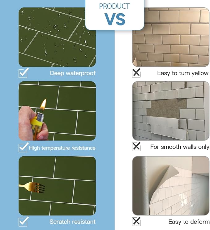 - √Strong resistant - This backsplash tile made of muti layer PVC composite laminate, more thicker than 3D wallpaper or vinyle tile on market, water proof, heat-resistant, anti-scratch, high impact, color fadeless, and easy to clean, suitable for the majority of interior application including real-life kitchen and bathroom.