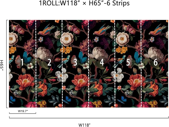 - 1 Roll Wallpaper Mural:65"H x 118"W (Covers 53.26 sq. ft. ). This mural wallpaper is cut into 6 strips for easy installation. Measure your wall and buy enough rolls