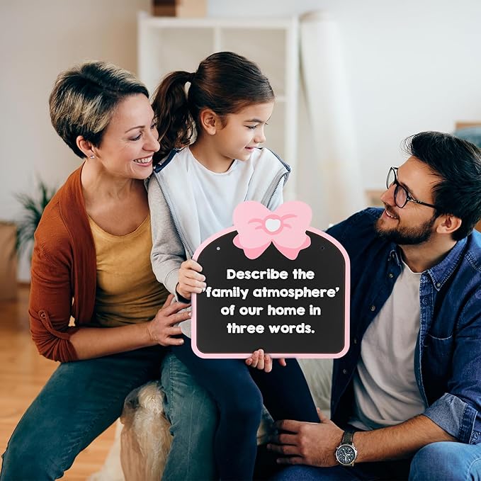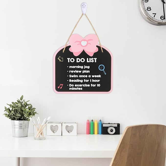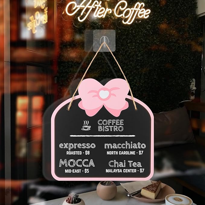 - -Cute pink bowknot appearance is more beautiful and attractive than the traditional blackboard. This sign hanging blackboard has no frame and has a larger usable area.