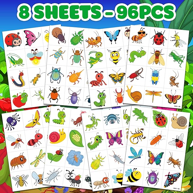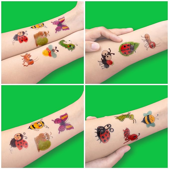 - Creative and Fun: This Bug Bees Spiders Beetles Butterflies Insect Pre-Cut temporary tattoos set includes a variety of playful and cute designs, encouraging your child's imagination and creativity. Bring nonstop joy to the whole birthday or party. Make your kids receive full of expectation and exploration in every festival.