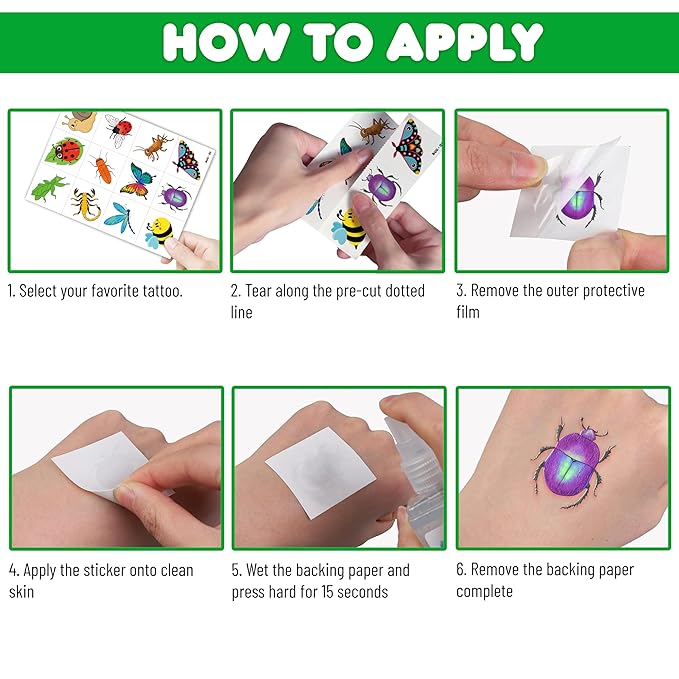 - Simple Application: With just a few easy steps, your child can apply these tattoos effortlessly. Tear off the tattoo of choice and remove clear sheet. Place tattoo face down on skin. Wet the tattoo thoroughly. After 15-20 seconds, gently remove the backing paper. Allow the tattoo to dry. These delicate stickers are usually retained all days and can be cleaned with baby oil or hand sanitizer.