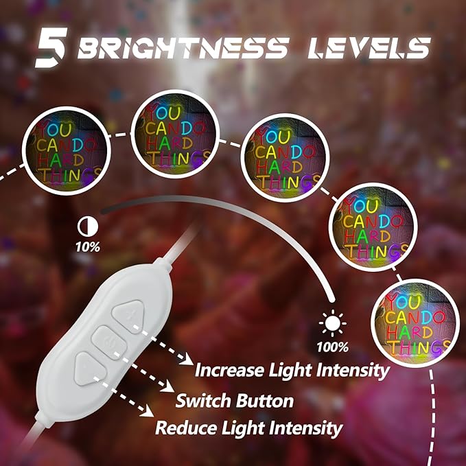 - 【Adjustable Brightness】You Can Do Hard Things Neon Light-13.8’x13’(35cm*33cm),suitable size,eye-catching and doesn't take up much space.Our LED You Can Do Hard Things Neon Light is a dimmable switch with a long USB cable.Press the “+”/”-”button,there are 5 gears can be adjusted to get the brightness you want.