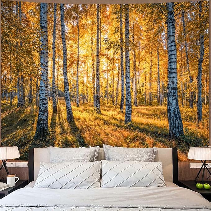 - This tapestry displays a golden autumn birch forest with sunlight streaming through bright yellow leaves and distinctive white birch trunks, bringing warm, vibrant fall woodland charm