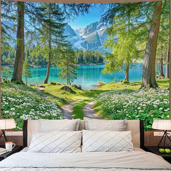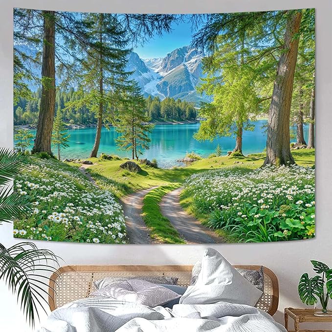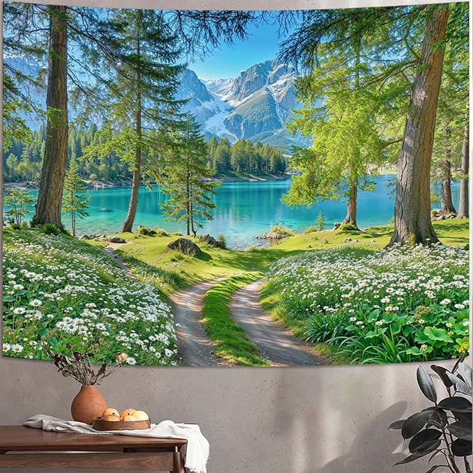 - This tapestry depicts a charming flower-lined path leading to a turquoise mountain lake, with snow-capped peaks and forests in the distance for a fresh, fantasy woodland-lake aesthetic