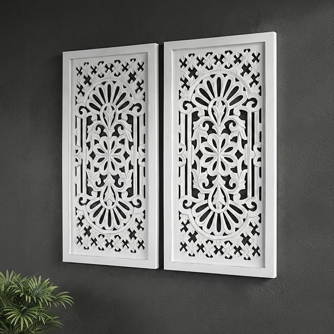 Wood Wall Art - Wall Panels in Handcrafted Carved Wood For Livingroom Bedroom,Dining room,Elegant Decorative Wall Art for Home & Office 12x24" Set of 2 White Antique_Cutwork Designs