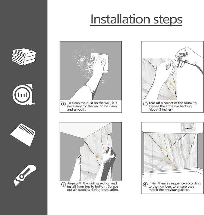 - Size introduction: The size of our mural is 90"X57", evenly divided into 4 parts, Each part is marked with a number below it. No overlapping patterns are required during installation.