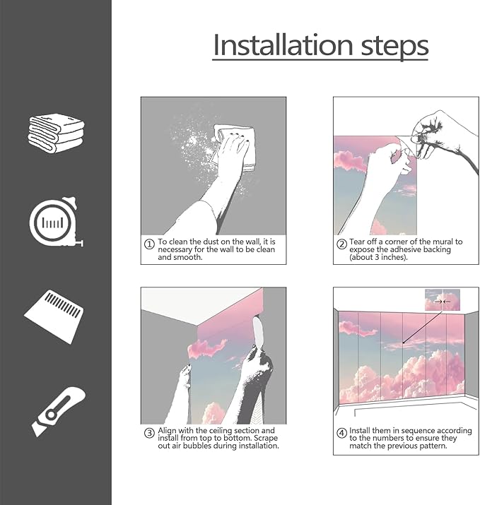 - Size introduction: The size of our mural is 160"X109", evenly divided into 8 parts, Each part is marked with a number below it. No overlapping patterns are required during installation.