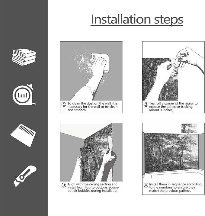 - Size introduction: The size of our mural is 90"X57", evenly divided into 4 parts, Each part is marked with a number below it. No overlapping patterns are required during installation.