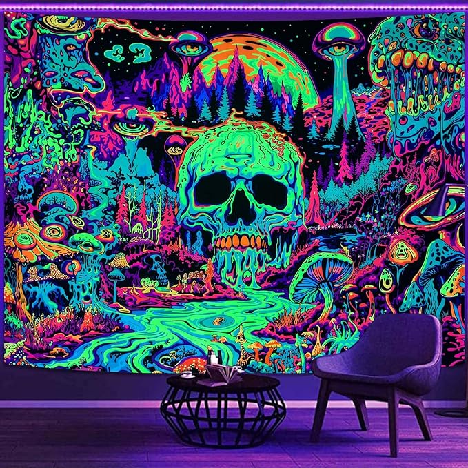 - This tapestry presents a hippie, neon-colored scene with a central skull, colorful mushrooms, and a surreal landscape—glows vibrantly under blacklight to bring bold, otherworldly artistic energy to your space