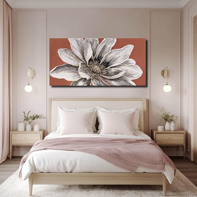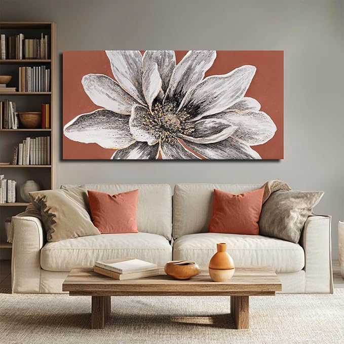 ZHENGYIN Floral Canvas Wall Art, Textured White Flower Painting with Terracotta Warm Tones, Rustic Modern Farmhouse Wall Decor for Living Room Bedroom, Above Sofa, 24x48 Inch