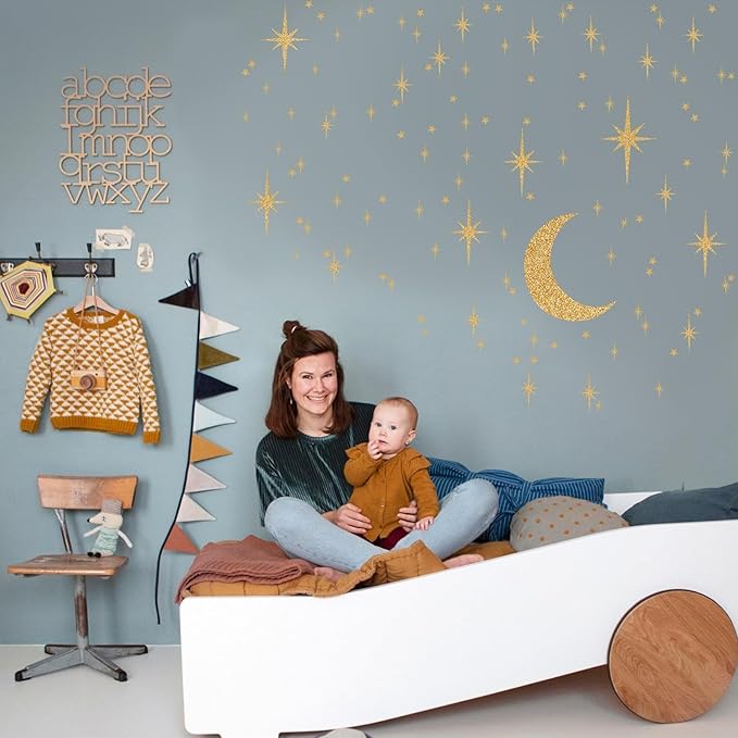 - 【Shimmering Gold Stars】: Features 100+ dazzling gold moon and star stickers in 5 sizes. Perfect for adding luxury accents to walls, ceilings, furniture, or photo backdrops—ideal for princess-themed rooms, glam home decor, or party decorations.